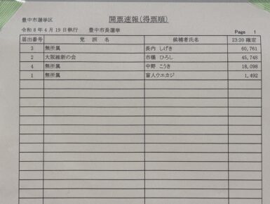 2026年04月19日【24時30分 最終更新 市議補選も確定/豊中市長選は現職の長内しげき候補が当選確実】令和8年4月19日執行「豊中市長選挙」および「豊中市議会議員補欠選挙(定数3)」の結果をお伝えします 豊中の話題 豊中の話題 【24時30分 最終更新 市議補選も確定/豊中市長選は現職の長内しげき候補が当選確実】令和8年4月19日執行「豊中市長選挙」および「豊中市議会議員補欠選挙(定数3)」の結果をお伝えします