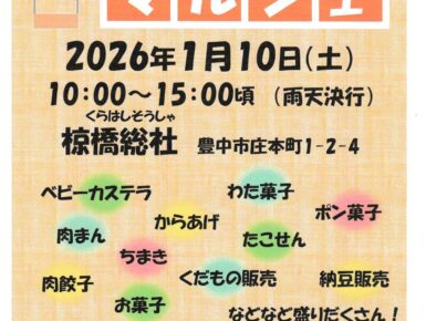 来年1月10日の土曜日、庄本町の椋橋神社境内にてマルシェが開催されます。唐揚げ、ベビーカステラ、綿菓子など盛りだくさん、冬休みのひととき、神社の境内でまったりとお過ごしください