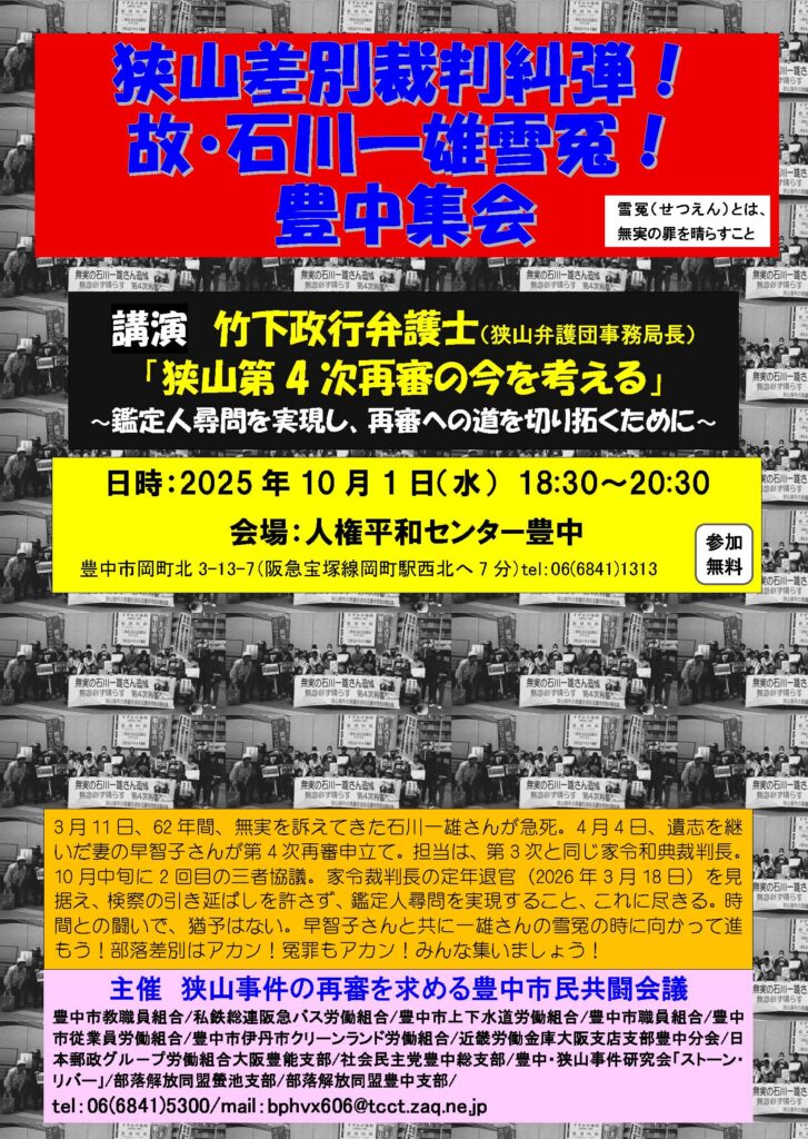 3月11日、62年間、無実を訴えてきた石川一雄さんが急死。4月4日、遺志を継いだ妻の早智子さんが第4次再審申立て。担当は、第3次と同じ家令和典裁判長。10月中旬に2回目の三者協議。家令裁判長の定年退官(2026年3月18日)を見据え、検察の引き延ばしを許さず、鑑定人尋問を実現すること、これに尽きる。時間との闘いで、猶予はない。早智子さんと共に一雄さんの雪冤の時に向かって進もう!部落差別はアカン!冤罪もアカン!みんな集いましょう! | |
