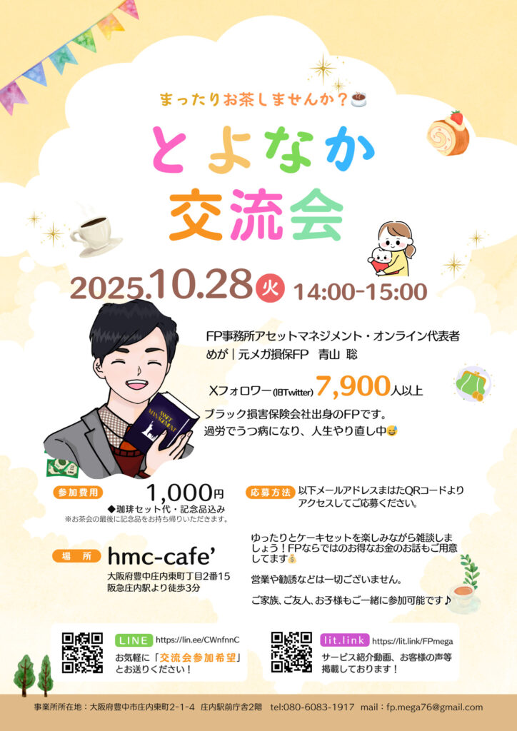 2025年10月28日(火)14~15時、阪急庄内駅東口から徒歩3分のオシャレなカフェ「hmcカフェ」にて交流会を行います。お気軽に雑談しに来ませんか?営業など一切ありません。ご安心ください。