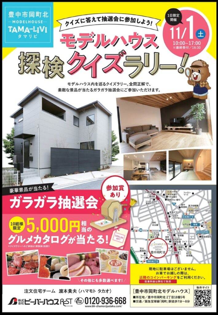 【参加無料・抽選会付き!】見るだけじゃもったいない! 豊中市民の回覧板 2025年10月20日投稿日:2025/10/20投稿者 豊中子育てパパ見るだけじゃもったいない! モデルハウス探検クイズラリー!!!豪華グルメカタログ(5,000円相当)が 当たるガラガラ抽選会!【限定10組】「豊中で家を建てたい」 「もっと暮らしやすい家に住み替えたい」 とお考えの皆様へ。家族が自然と集まり、心地よい時間が流れる家 「豊中市岡町北」のモデルハウス見学会を 参加型のクイズラリー形式で開催します!ただ家を見て回るだけでなく、この家の 「すごい工夫」をクイズを解きながら 楽しく発見し、家づくりのヒントを 持ち帰ってください。2025年11月1日(土) の1日限定開催! 10:00~17:00 (最終受付 16:30)モデルハウスのクイズラリーに 全問正解すると、5,000円相当の 豪華グルメカタログが当たる ガラガラ抽選会にチャレンジ!! 新しい家での食卓を豊かにする 美味しいグルメをゲットしてください。 ※1グループ(ご家族)につき 抽選は1回限りとなります。 ※景品がなくなり次第、抽選会は 終了となります(10組様限定)。 お早めにご予約ください。株式会社ビーバーハウス REST 注文住宅チーム 北大阪 0129-936-668 担当 濵本貴夫(ハマモト タカオ) 大阪市淀川区東三国3丁目10番11号 2階一覧へ戻るトップページへ戻る おしらせ 2025.10.20 「増山先生直筆のサイン入り本」プレゼント当選者のお知らせ 2025.10.10 10/10 配信予定だった「豊中こども報道」の記事の配信を延期します 2025.05.23 TNNメンバーに「チカ@TNN」が新たに加わりました 一覧を見るおしらせ 2025.10.20 「増山先生直筆のサイン入り本」プレゼント当選者のお知らせ 2025.10.10 10/10 配信予定だった「豊中こども報道」の記事の配信を延期します 2025.05.23 TNNメンバーに「チカ@TNN」が新たに加わりました 一覧を見る