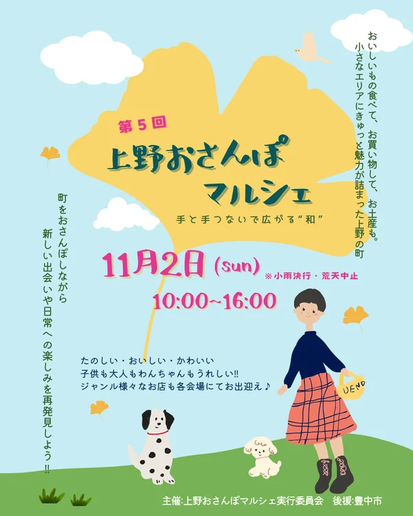 第5回上野おさんぽマルシェ 豊中市民の回覧板 2025年10月21日投稿日:2025/10/21投稿者 上野おさんぽマルシェ実行委員会日にち:11月2日(日)10:00~16:00 場所:豊中市上野地区。府道43号線沿いの各会場と店舗にて美味しいもの食べて、お買い物して、お土産も。 小さなエリアにきゅっと魅力が詰まった上野の町。地域住民の皆さまに楽しみをお届けし、明るい日々のくらしへの貢献に繋がることを願い,上野をおさんぽしながら住む地域のお店や活動をがんばる方に目を向けることで社会の循環がうまれるきっかけになってほしい… そんな想いで上野おさんぽマルシェは2021年より小さくスタートしました。 ぜひ秋のおさんぽにお出掛けください♪上野お散歩マルシェ一覧へ戻るトップページへ戻る おしらせ 2025.10.20 「増山先生直筆のサイン入り本」プレゼント当選者のお知らせ 2025.10.10 10/10 配信予定だった「豊中こども報道」の記事の配信を延期します 2025.05.23 TNNメンバーに「チカ@TNN」が新たに加わりました 一覧を見るおしらせ 2025.10.20 「増山先生直筆のサイン入り本」プレゼント当選者のお知らせ 2025.10.10 10/10 配信予定だった「豊中こども報道」の記事の配信を延期します 2025.05.23 TNNメンバーに「チカ@TNN」が新たに加わりました 一覧を見る