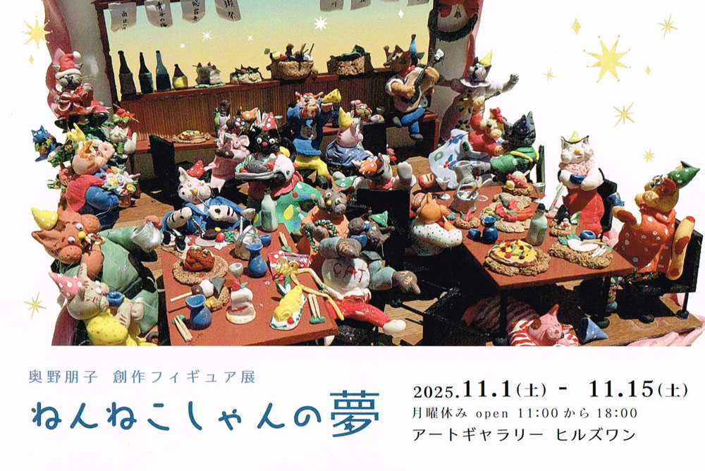 ねんねこしゃんの夢 創作フィギュア展 豊中市民の回覧板 2025年10月22日投稿日:2025/10/22投稿者 古角武司2025.11.1(土)~11.15(土)まで、豊中稲荷神社前のライフを少し上がった、アートギャラリー ヒルズワンにて11時~18時に、豊中在住の粘土作家、奥野朋子さんの創作粘土フィギュアの展覧会を開催します。樹脂粘土コスモスによるネコやクリスマスをモチーフにした、見ていると幸せになる作品を多数展示いたします。皆様のご来場をお待ちしています。(豊中市本町6-1-1 ヒルズワン2F 月曜休み) 一覧へ戻るトップページへ戻る おしらせ 2025.10.20 「増山先生直筆のサイン入り本」プレゼント当選者のお知らせ 2025.10.10 10/10 配信予定だった「豊中こども報道」の記事の配信を延期します 2025.05.23 TNNメンバーに「チカ@TNN」が新たに加わりました 一覧を見るおしらせ 2025.10.20 「増山先生直筆のサイン入り本」プレゼント当選者のお知らせ 2025.10.10 10/10 配信予定だった「豊中こども報道」の記事の配信を延期します 2025.05.23 TNNメンバーに「チカ@TNN」が新たに加わりました 一覧を見る