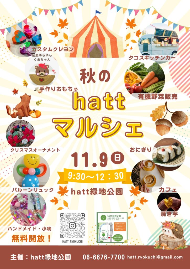 ☆11.9(日)hatt緑地公園にてhattマルシェ開催☆ 豊中市民の回覧板 2025年10月26日投稿日:2025/10/26投稿者 喜多村 英子11月9日(日)9:30〜12:30 ☆秋のhattマルシェ開催します☆ 手作りおもちゃ、唐揚げ、フランクフルト、ドリンク(¥100〜)などもご用意しております。 当日は、豊中の多言語対応ベビーシッターサービス会社MommyBless (ウェブサイト) ふだんは利用料がかかるあそび場&カフェスペースを無料開放します。 お子さまがいらっしゃるパパママはもちろん、みなさまのお越しをお待ちしております!! みなさまのお越しをお待ちしております。 hatt緑地公園 06-6676-7700 hatt.ryokuchi@gmail.com一覧へ戻るトップページへ戻る おしらせ 2025.10.20 「増山先生直筆のサイン入り本」プレゼント当選者のお知らせ 2025.10.10 10/10 配信予定だった「豊中こども報道」の記事の配信を延期します 2025.05.23 TNNメンバーに「チカ@TNN」が新たに加わりました 一覧を見るおしらせ 2025.10.20 「増山先生直筆のサイン入り本」プレゼント当選者のお知らせ 2025.10.10 10/10 配信予定だった「豊中こども報道」の記事の配信を延期します 2025.05.23 TNNメンバーに「チカ@TNN」が新たに加わりました 一覧を見る