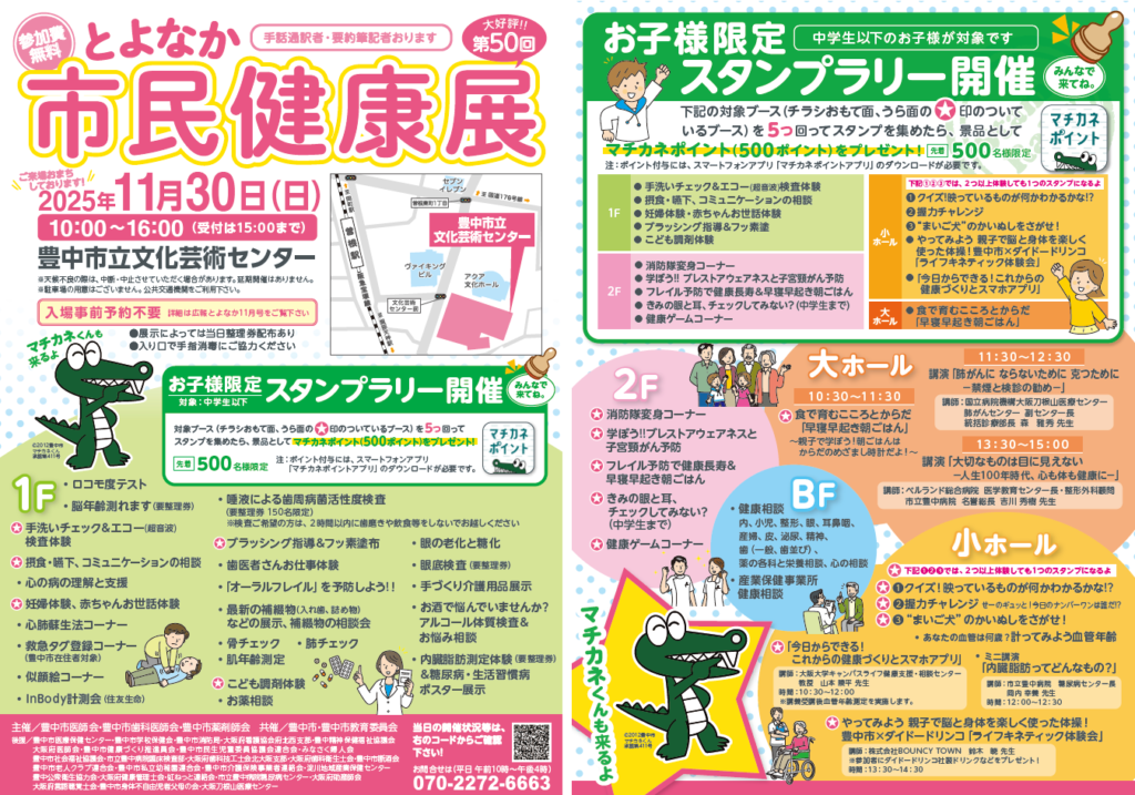 今月末11月30日(日)に、豊中市民のみなさんの健康づくりを応援する【第50回とよなか市民健康展】を開催いたします! こどもからおとなまで、どなたでも楽しみながら健康について学べる・体験できるイベントです。健康チェックや健康相談、市民講座など、会場全体で様々な催しを予定しております。詳しくは、チラシ・ポスターのデータをご覧ください。 みなさまのご来場をお待ちしております🍀 【開催日】令和7年(2025年)11月30日(日曜) 詳しくは下記ホームページに掲載のポスター・チラシをご覧ください。 【主催】豊中市医師会・豊中市歯科医師会・豊中市薬剤師会 ✋✏手話通訳者・要約筆記者おります。ご希望の方は当日受付にお越しください。 ※天候不良の際は、中断・中止させていただく場合があります。延期開催はありません。 ●お問合せ先●