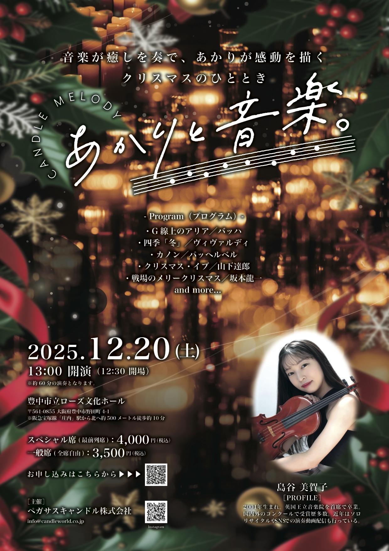 【公演情報】 【キャンドルのプロが贈る、コンサート】 ▼こんな方におすすめ -- Program(プログラム)-- -- Performance(出演)-- -- Attention(ご案内)-- | |