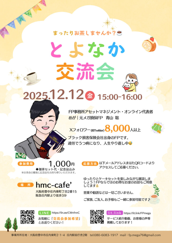 FP(ファイナンシャルプランナー)の青山 聡です。12月12日(金)15~16時、hmcカフェさんにて「とよなか交流会」を開催します。いろんな方とのご縁のきっかけ作りを目指してます。勧誘とか一切ないですし、話すことも決めてなくて参加者さんの興味のある話題にしようと思ってます。ご参加お待ちしてます😊