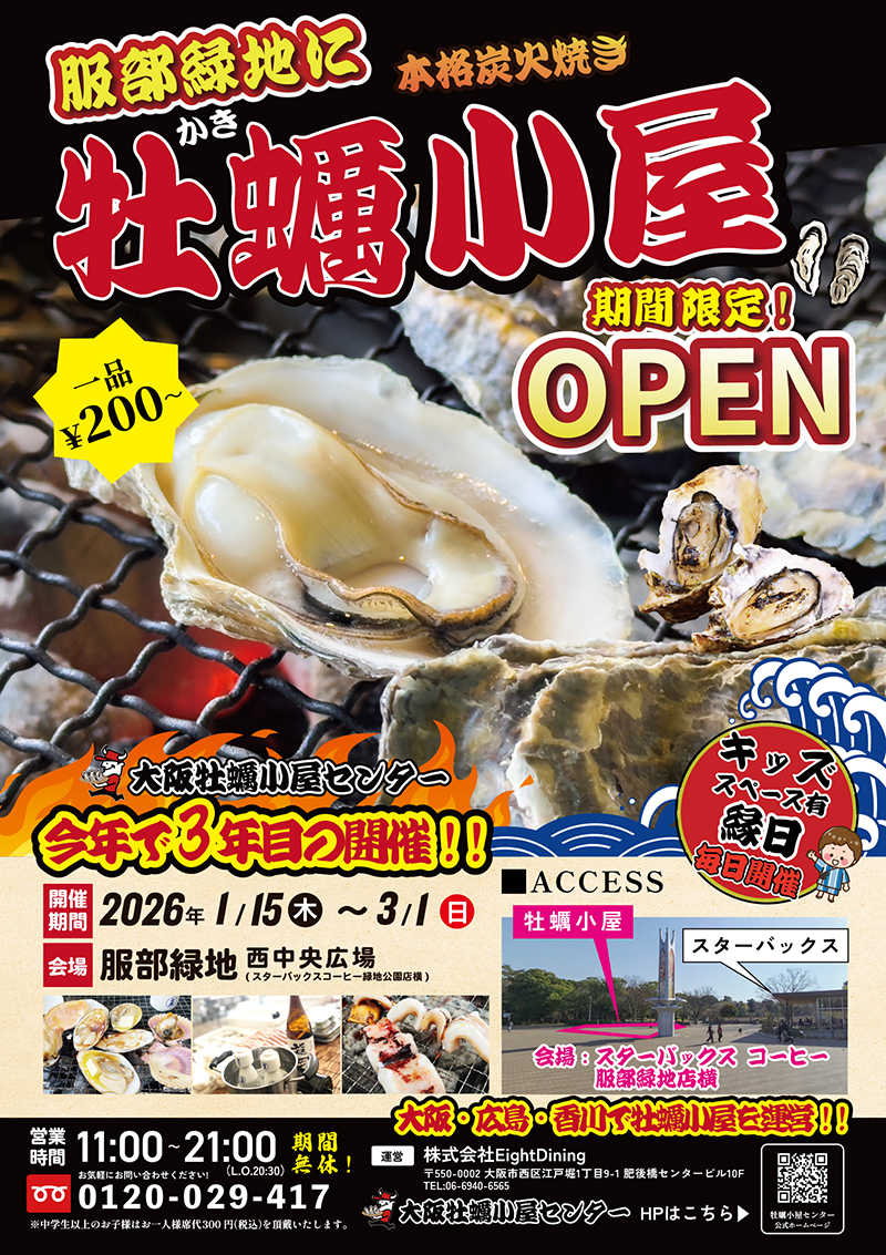 今年も服部緑地に帰ってきた‼ お好きな食材を炭火焼きでリーズナブルに楽しめる移動出店型の本格牡蠣小屋です。 炭火で本格的に味わう、全国の厳選ブランド牡蠣を堪能できる絶好の機会‼ 本イベントでは、全国各地から厳選したブランド牡蠣を販売。 炭火でじっくり焼き上げることで、牡蠣の旨味と香ばしさを引き立てます。 お子様も楽しめる縁日コーナー、わんちゃんも一緒にテラス席も充実‼ 会場にはお子様向けの縁日コーナー、わんちゃんも一緒に楽しめるテラス席もご用意しております。 ≪開催概要≫ 開催場所:服部緑地(豊中市) 開催期間:2026年1月15日(木)~2026年3月1日(日) 営業時間:11時~21時(LO20時半) ≪開催実績≫ 【株式会社EightDining】 ※予定が変更となる場合がございます。 | |