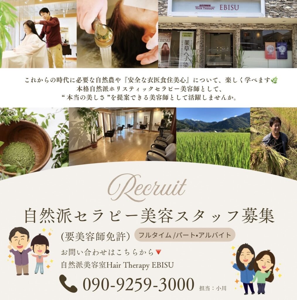 \このような美容師さん大歓迎です!/ 上記のいずれかに該当する方のご応募をお待ちしております☎️ \自然派美容室EBISUのこだわり/ ❄️年末年始営業日のお知らせ❄️ 年末年始 休業期間: 1月6日(火)から通常営業致します。 【通常ですと、月・火曜日は定休日ですが、年末の12月29日(月)、30日(火)並びに、年始1月6日(火)は営業いたします。】 ___________________________ 自然派美容室EBISU