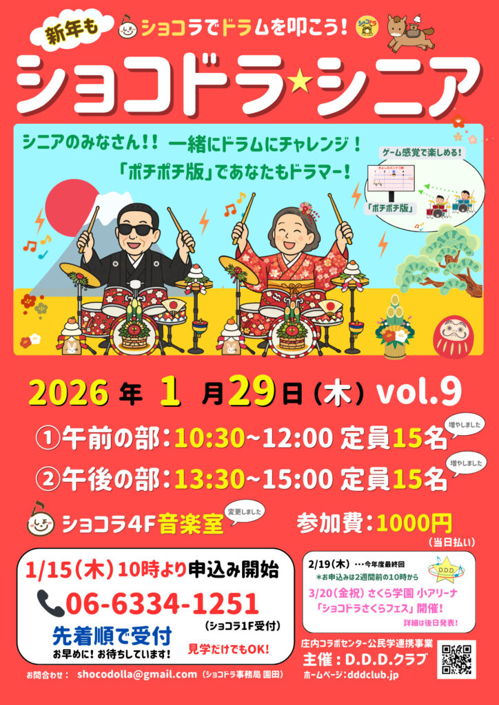 「ショコドラ★シニア」は、主にシニア世代を対象とした、気軽に楽しめるドラム体験イベントです♪ 午前と午後の【2部制】で開催! ⸻ 🥁 第9回 開催概要 📅 1月29日(木) ⸻ 📞 申込み方法 📅 受付開始:1月15日(木)10:00〜 ✅ 先着順受付です! 午前午後どちらかお伝えください ⸻ さらに詳しい情報は、D.D.D.クラブのホームページ(dddclub.jp)をご覧ください。 *「ショコドラ★シニア」は、月1回のペースで開催予定です。 | |