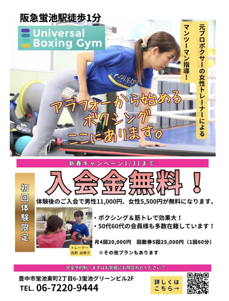 阪急蛍池駅のユニバーサルボクシングジムが只今新春キャンペーン実施中! 忘年会&お正月で暴飲暴食して運動サボってしまったみなさんそろそろ体を元に戻していきませんか? ダイエットは冬に始める事を強くオススメします! 今なら入会金無料なのでお得です! | |