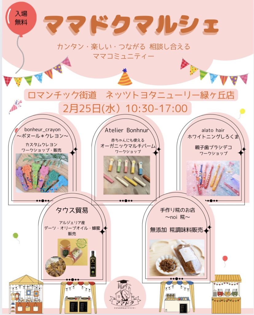 カンタン・楽しい・つながる \ママドクマルシェ Vol.2/ 同年代ママや先輩ママが出店するママドクマルシェにふらっと遊びに来ませんか? 会場はロマンチック街道沿い ママもお子さまも楽しめる ☺ ちょっと大人とおしゃべりしたい そんなママ、大歓迎です♡ ※各ブースの詳しい内容は 📣\出店者さんも募集中!/ 詳しくはInstagram過去投稿をご覧ください🌸 ご質問はお気軽に | |