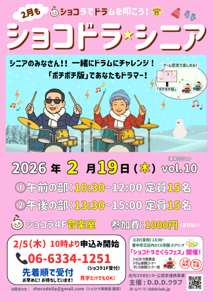 「ショコドラ★シニア」は、主にシニア世代を対象とした、気軽に楽しめるドラム体験イベントです♪ 午前と午後の【2部制】で開催! ⸻ 🥁 第10回 開催概要 📅 2月19日(木) ⸻ 📞 申込み方法 📅 受付開始:2月5日(木)10:00〜 ✅ 先着順受付です! 午前午後どちらかお伝えください ⸻ さらに詳しい情報は、D.D.D.クラブのホームページ(dddclub.jp)をご覧ください。 *「ショコドラ★シニア」は、月1回のペースで開催予定です。 | |