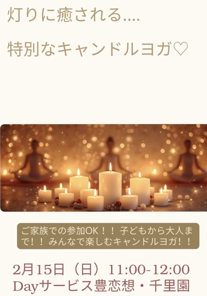 2月15日(日) 開催 キャンドルヨガ 豊中市民の回覧板 2026年02月06日投稿日:2026/2/6投稿者 Dayサービス豊恋想・千里園 キャンドルのやさしい灯りに包まれて 心と身体をゆっくり整える 特別なキャンドルヨガ🕯️✨難しいポーズはありません。 お子さまから大人まで ご家族みなさんで楽しめます。ヨガマット不要・手ぶらでOK! 動きやすい服装でお気軽にご参加ください。地域と介護を繋ぐ場所💓📅 2月15日(日) 🕚 11:00〜12:00 📍 Dayサービス豊恋想・千里園お待ちしてます♪ 一覧へ戻るトップページへ戻る おしらせ 2026.02.04 【予告】求人サービス「TNN WORK」を開始します 2026.02.03 【予告】新たな記者仲間を募集します 2025.11.15 「豊中こども報道」の配信を休止します 一覧を見るおしらせ 2026.02.04 【予告】求人サービス「TNN WORK」を開始します 2026.02.03 【予告】新たな記者仲間を募集します 2025.11.15 「豊中こども報道」の配信を休止します 一覧を見る