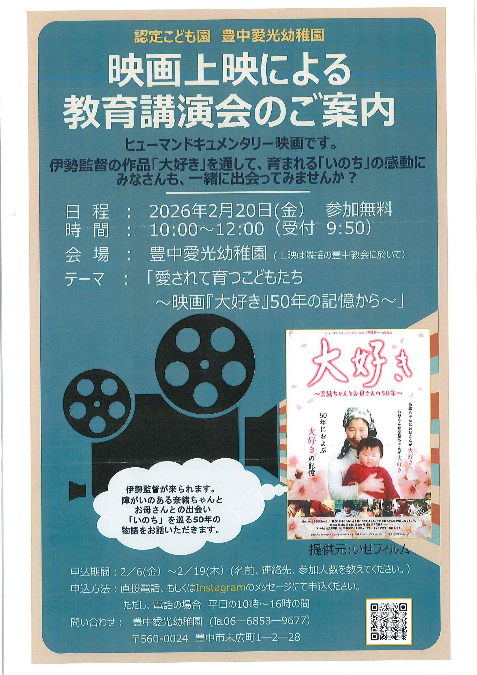ヒューマンドキュメンタリー映画、伊勢監督の作品『大好き』を通して、 育まれる『いのち』の感動に、みなさんも一緒に出会ってみませんか? 伊勢監督が来られます‼「いのち」を巡る50年の物語をお話しいただきます。 おこさまを連れての参加も可能です。 日時 : 2026年2月20日(金) 10:00~12:00(受付9:50~) 申込期間 : 2月19日(木)まで | |