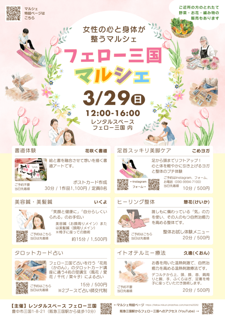 大阪府豊中市三国にあるレンタルスペース「フェロー三国」にて、女性向けの癒やしと体験のイベント『フェロー三国マルシェ』を開催いたします。 占いや整体、美容鍼、イトオテルミー温熱療法、書道アートなどの体験ブースをはじめ、亀岡の農園の採れたて野菜やお花、編み物の販売など、女性の「心と身体が整う」コンテンツが盛りだくさんです。 入場は無料ですので、ぜひお気軽にお立ち寄りください。 【イベント概要】 【出店内容・料金】 《物販》 【注意事項】 【詳細・お問い合わせ先】 | |