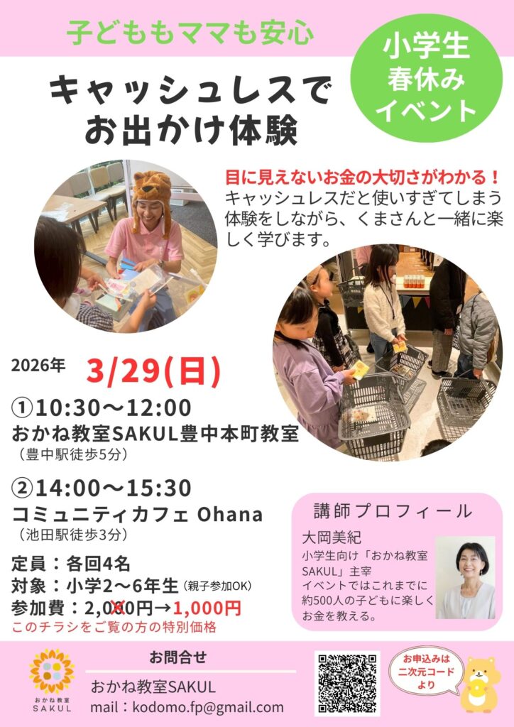 くまさん🐻と一緒におでかけしながら、キャッシュレス💳📱でのお買い物を体験します。 キャッシュレス化が進み、実際のお金のやり取りを目にする機会が減ったことで、算数の計算はできるのに「おつり」がわからない小学生がいる今。 学校では教えてもらえないお金のことを、お子様に学ばせてあげませんか? ❓キャッシュレスだとついつい使いすぎてしまう⁉ 🍀こんなお子様に向いています 🍀イベントの流れ 🍀保護者様のご感想 日時:2026年3月29日(日)10:30~12:00 🍀お申込🍀 ※14:00~15:30に池田駅前コミュニティカフェ Ohanaでも開催!