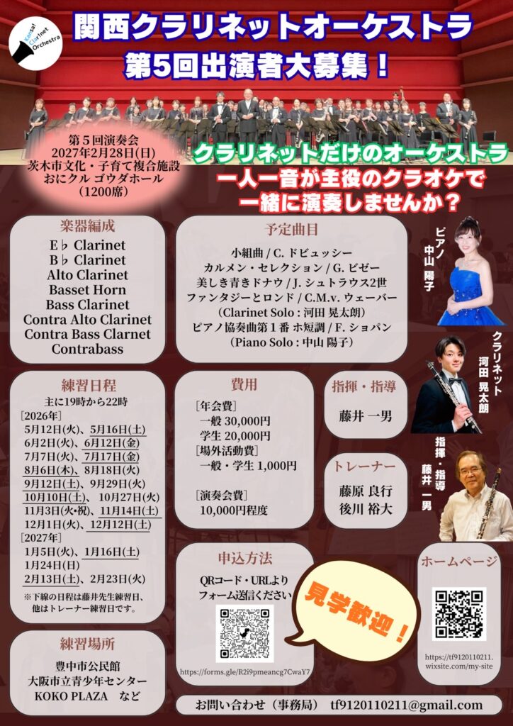 2027年2月28日(日)大阪府茨木市おにクル ゴウダホール(1,201席)にて、一緒に舞台で演奏してくださる奏者募集いたします。 関西クラリネットオーケストラ問合せ先 | |