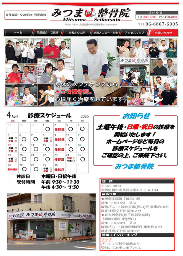 履正社中学校・高等学校のすぐ近くにある、みつま整骨院です。 平日だけでなく、土曜、日祝の午前中も診療しております。(木曜お休み) 特殊なグローブ通電での治療を中心に、「痛みをとりたい!」をお手伝い。 土曜、日曜、祝日も診療をしておりますので、お気軽に是非! 【 みつま整骨院 】 | |