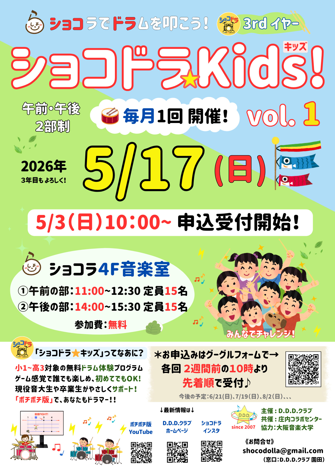 小中高生向けのインクルーシブなドラム体験プログラム「ショコドラ⭐︎キッズ!」〜ショコラでドラムを叩こう!〜 を5月17日(日)に開催します! 誰でも楽しめる内容で、初心者の方も大歓迎です。 参加のお申込みはチラシに掲載のQRコードからGoogleフォームで受付けます。 受付開始は5月3日(日)10:00から、各時間帯とも先着15名までとなります。参加費は無料です。 より詳しい情報はD.D.D.クラブのホームページ(https://dddclub.jp)をご覧ください。 「ショコドラ⭐︎キッズ!」は毎月1回、開催を予定しています。 最新情報はホームページに随時アップしていきますので、ぜひチェックしてください。 本プログラムは、ショコラ(豊中市庄内コラボセンター)、D.D.D.クラブ(豊中を拠点に活動するインクルーシブな音楽団体)、大阪音楽大学が協力して実施しています。 多くのお申込みをお待ちしています! | |