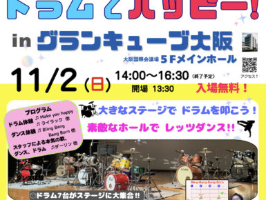 - 9月に豊中市立ローズ文化ホールで開催した「子どもドラムフェスタ2025」そのビッグサイズ出張版イベント、「子どもも、大人も、歌って踊ってドラムでハッピー! in グランキューブ大阪」を、11月2日(日)に開催します!