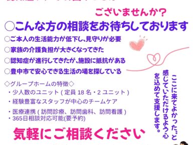 - 家族のように寄り添いながら心やすらぐ暮らしを支える介護を行い、穏やかな日々をともに過ごすしあわせを大切にしているグループホームですので、ご相談があればお気軽にお声かけください。
