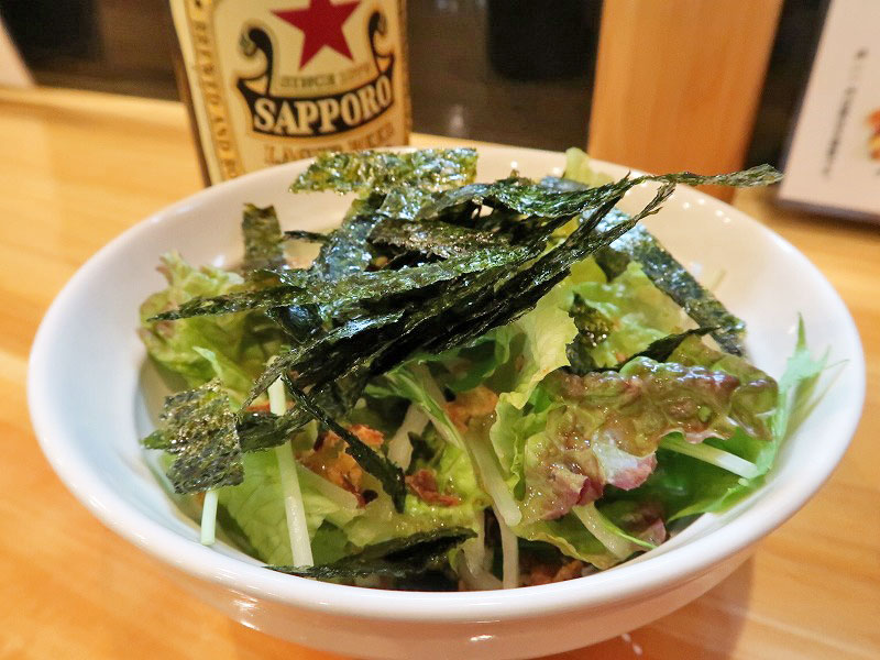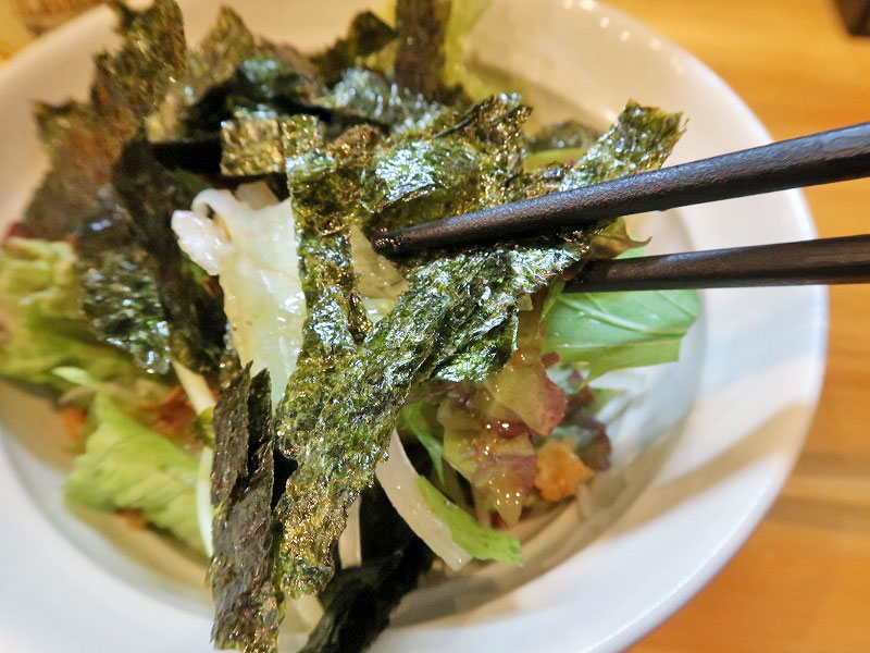 フレッシュな葉野菜に、ザクザクのフライドオニオンと焼きのりのアクセントが良い塩味になっています。
