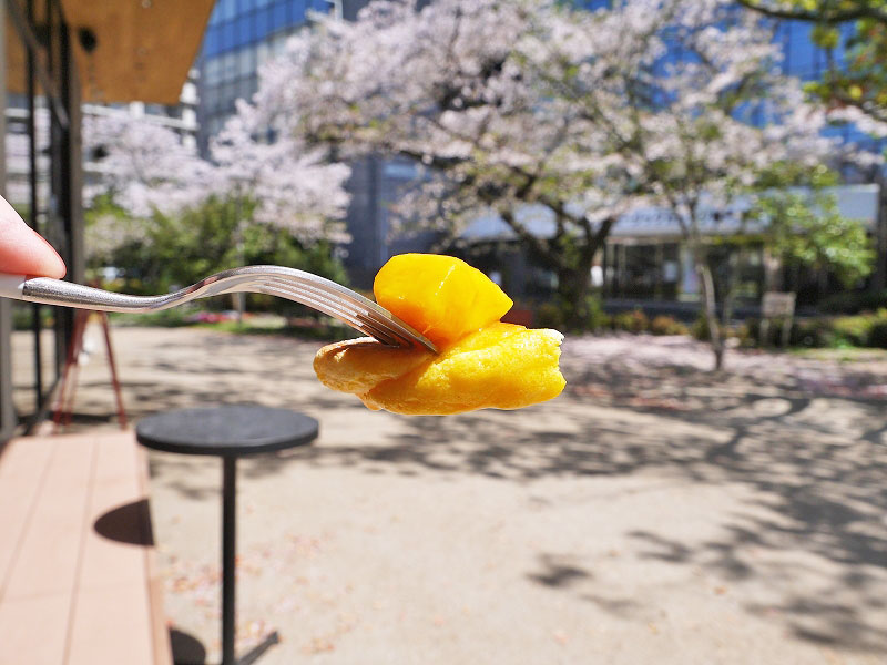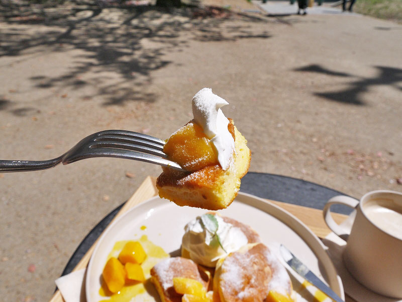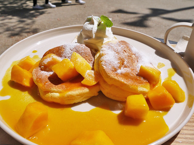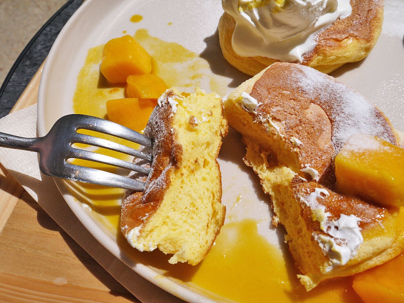 パンケーキ自体は甘さ控えめなので、甘~いマンゴーと一緒に食べると丁度いいんです。