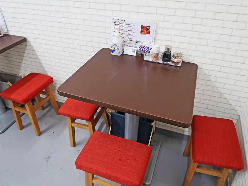 子連れだったので、端のテーブル席につかせていただきまして※背もたれのない椅子ですが、しっかり座れる年齢のお子さんで壁際なら座れそう