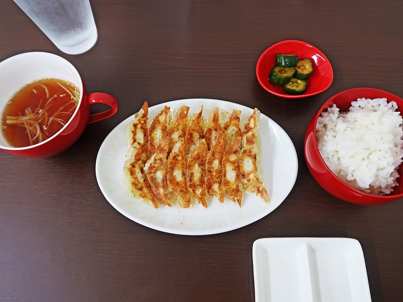 美味しそう~~!餃子ダブル(14個)に、ごはん・おつけもの・スープ付きです。※定番餃子ダブルセット/950円(税込)
