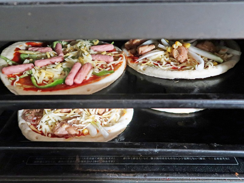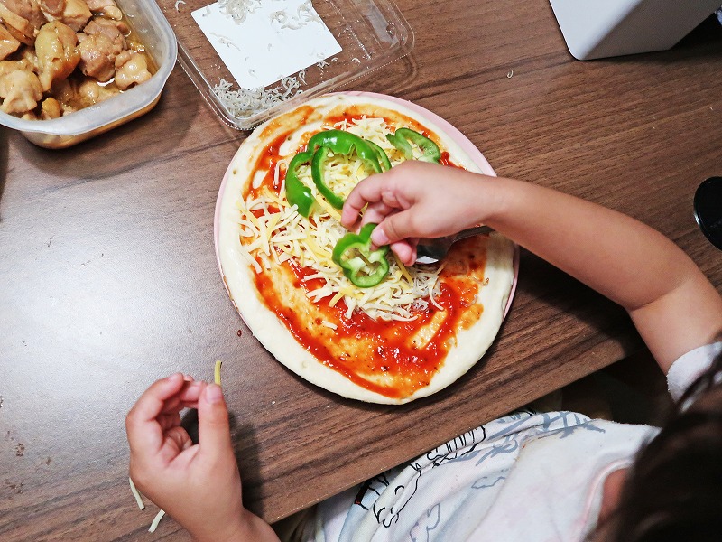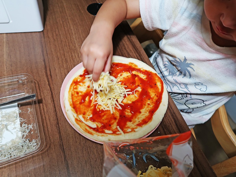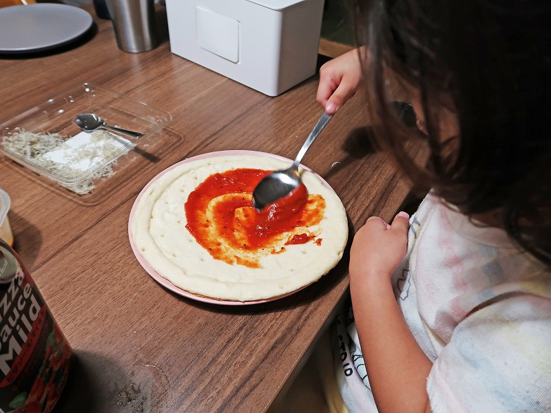 買ってきたピザ生地にピザソースをえいっ!とかけて。縁がしっかりあるから、子どもでもソースがこぼれにくくていいですね。