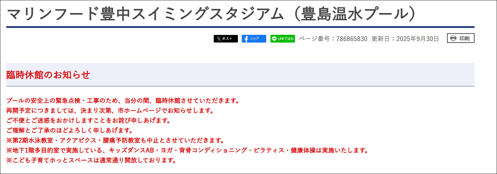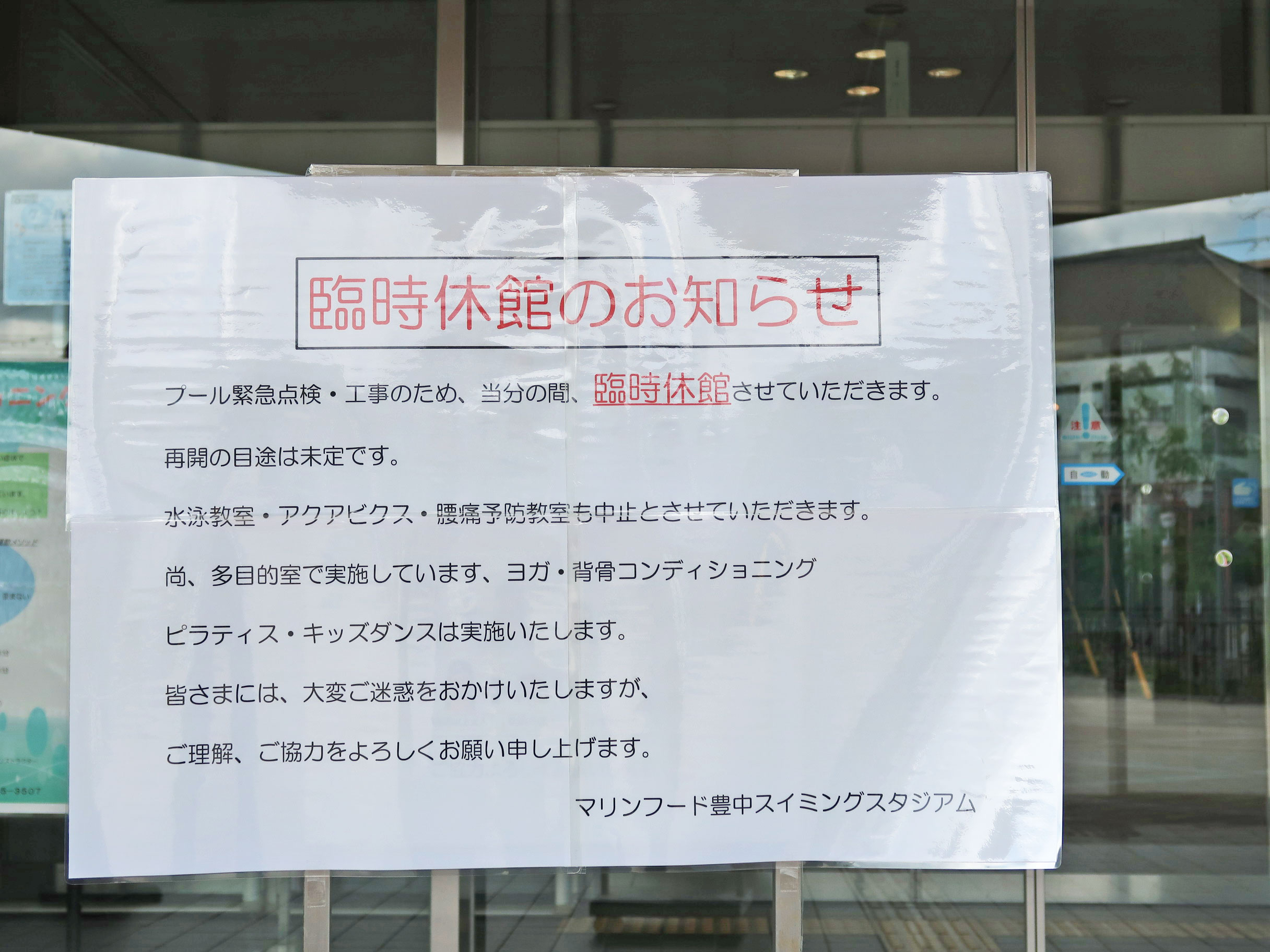 服部西町にある「マリンフード豊中スイミングスタジアム」が当分の間臨時休館するようです。