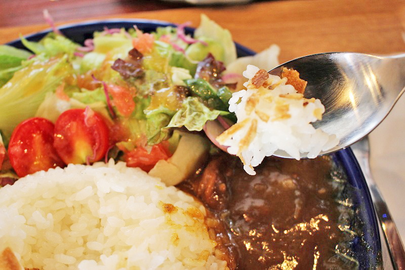 ライスの上に、フライドオニオンかガーリックらしき物が乗っているのですが、食べてみるとゴボウチップスでした。斬新やけど八百屋さんならではの発想ですね。