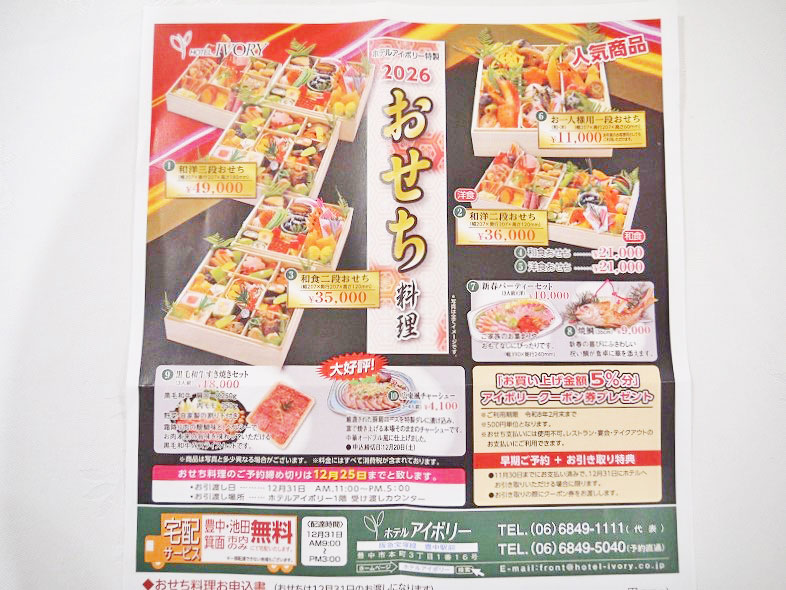また「ホテルアイボリー」では、現在「おせち料理」の予約を受け付け中なんだって。なんと豊中、池田、箕面市内へは「宅配無料」ですよ~♪