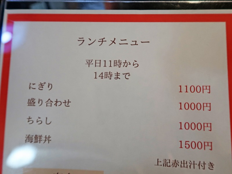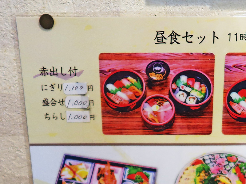 一応聞いたら、ちゃんとこのお値段だそう。安すぎる~!(驚)にぎりやちらしの他に定食も色々ありますね。