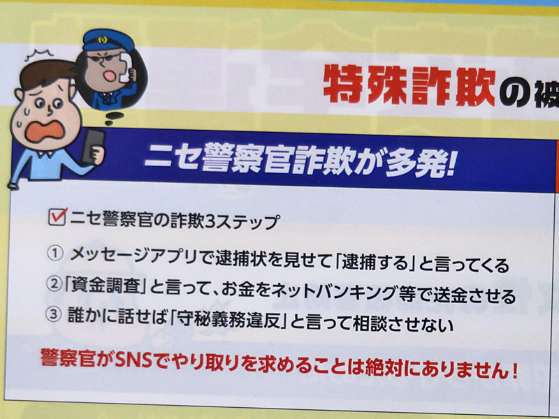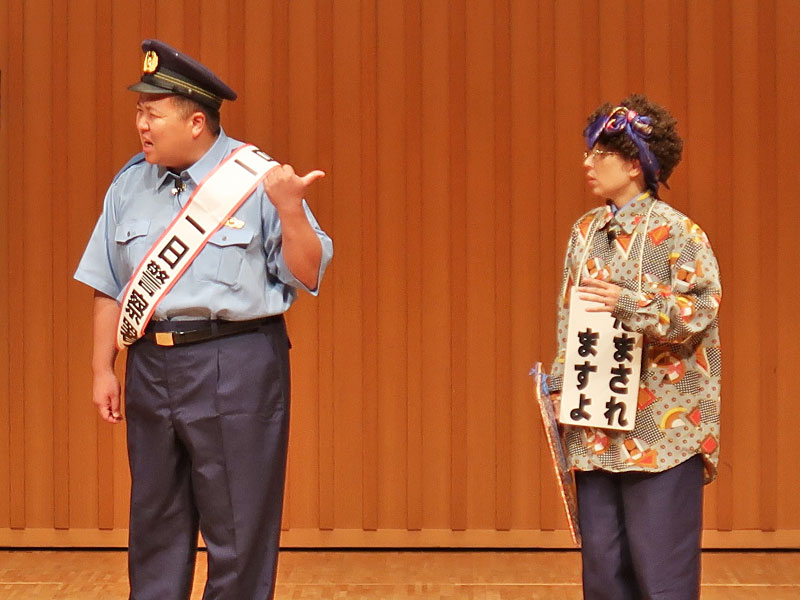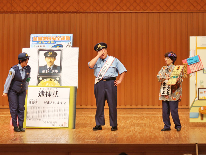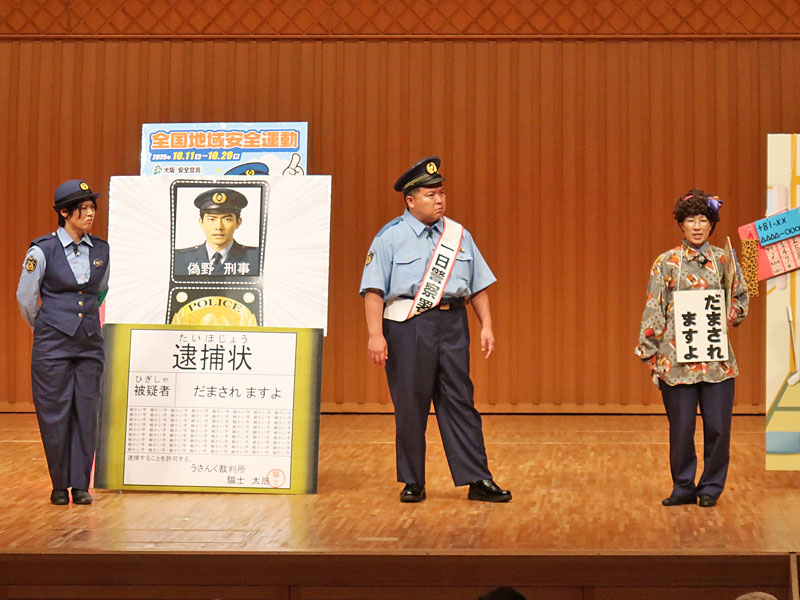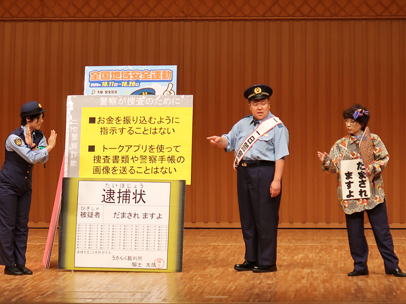 詳しい特殊詐欺の手口が寸劇で再現されていたので、TNNでもご紹介しますね。※中央は今年2回目?の1日警察署長、豊中市出身のミサイルマン西代さんです