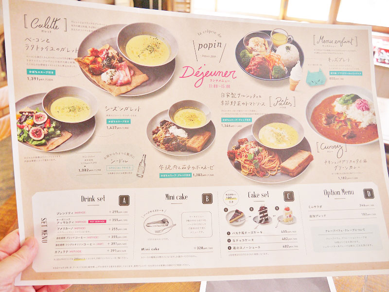 ランチメニューはこんな感じ。「ガレット」や「パスタ」、「カレー」など選べるんですね。もちろんキッズプレートも。※タップorクリックで拡大