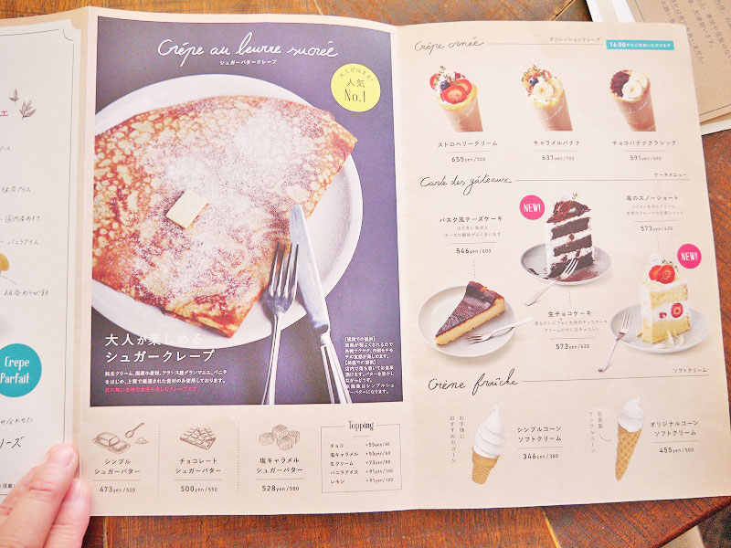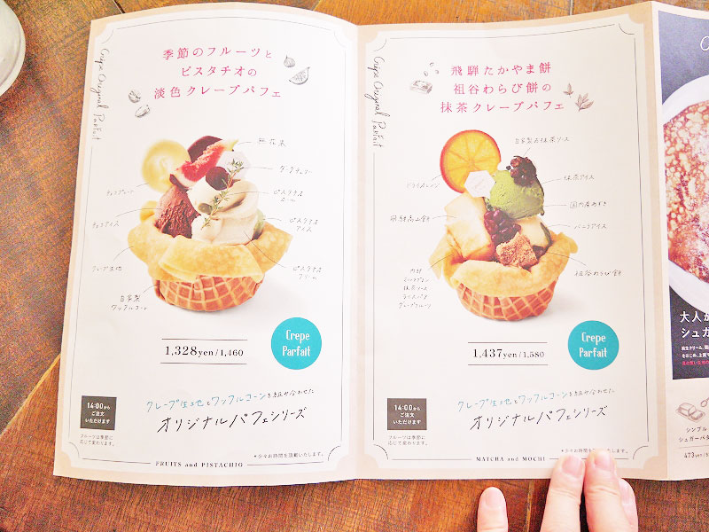 注文を終えたので、他のメニューも見てみましょうか。クレープにも力を入れているということで、こんなかわいいクレープパフェも♪