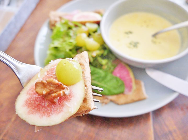 とろけるような甘味のいちぢくとフレッシュなマスカットが、そばの風味豊かで柔らかなガレットとよく合ってる~。