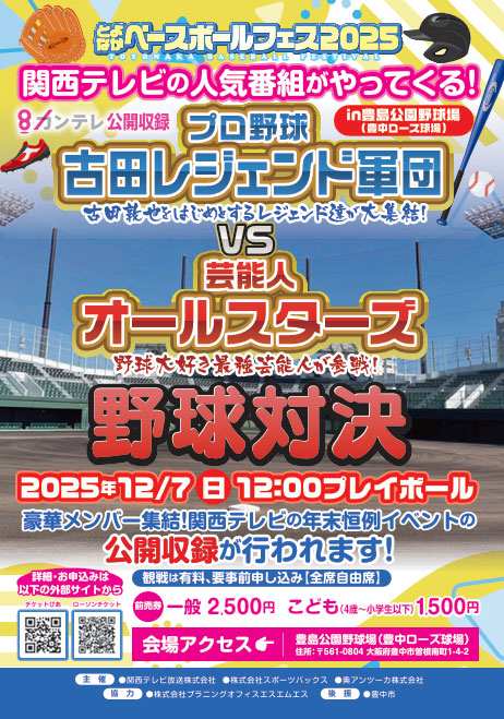 豊中ローズ球場でカンテレの年末特番『プロ野球レジェンド軍VS芸能人オールスターズ』の公開収録が行われるようです。