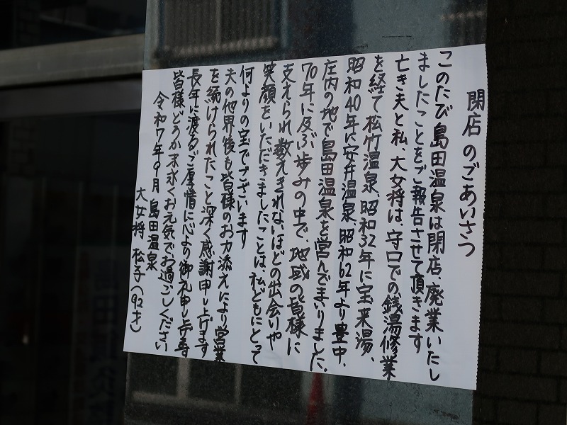 約40年の歴史に幕/庄内栄町にある「島田温泉」が閉店している