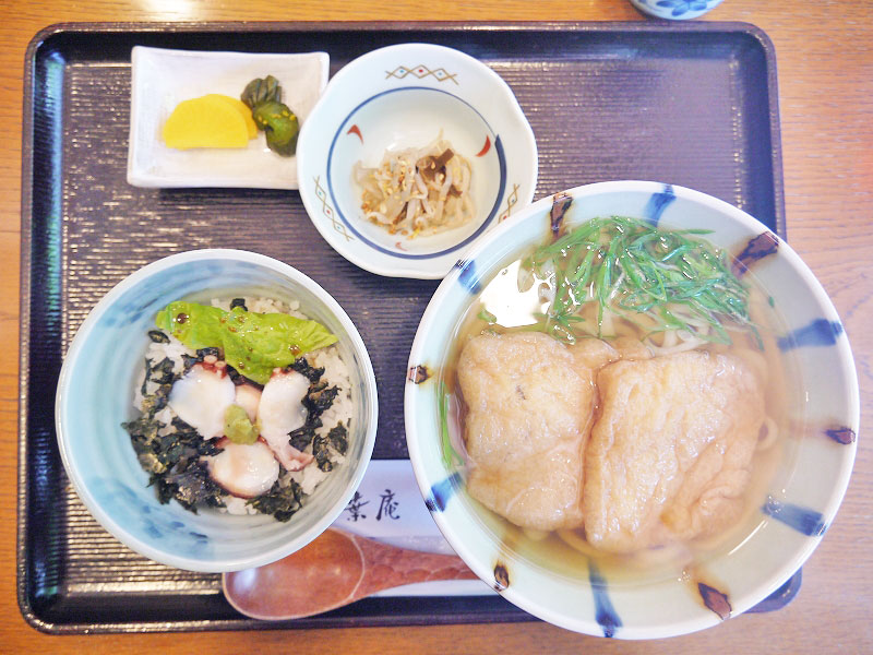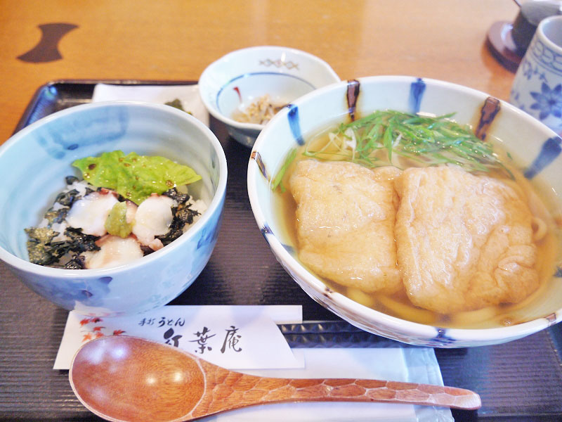 ふわふわな大きな油揚げが2枚も乗った「きつねうどん」に「本日の日替わりミニ丼(たこ丼)」のお出ましでーす♪※きつねうどん(850円)/日替わりミニ丼(うどんとセットで250円)/すべて税込/2000円以上でカード払いOK