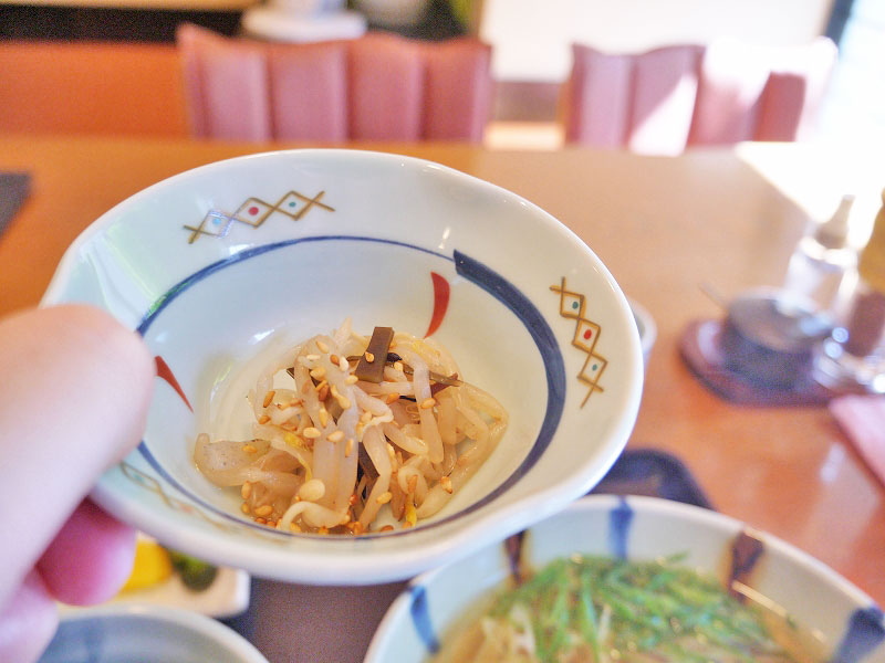 小鉢の「もやしとこんぶの和え物」は、ちょっと酸っぱくてシャッキとしたお味。お漬物もたこ丼と一緒に美味しくいただきましたよ。