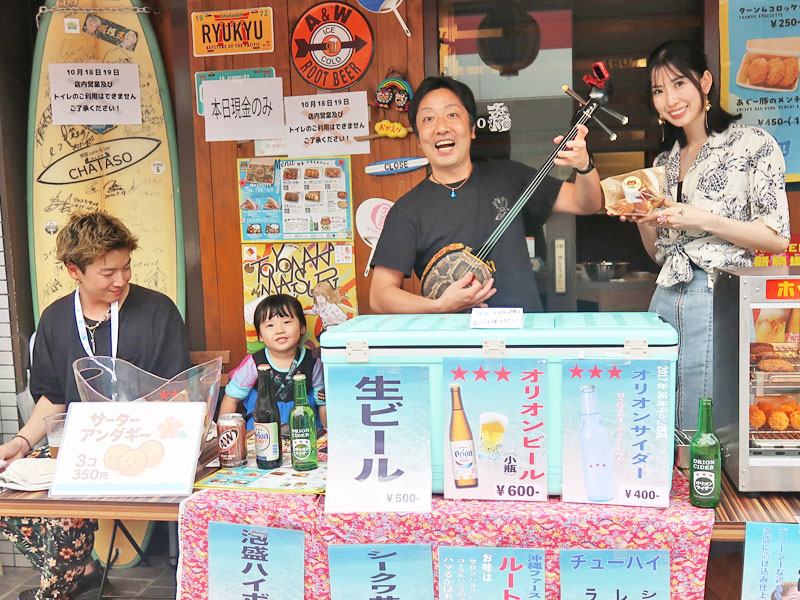 豊中まつりの会場北側(北ゲート近く)には、南国料理のお店「CHATASO(チャタソ)」があるので寄ってみたんですが※三線を巧みに奏でる元ミュージシャンの店主、岩本さん(中央)