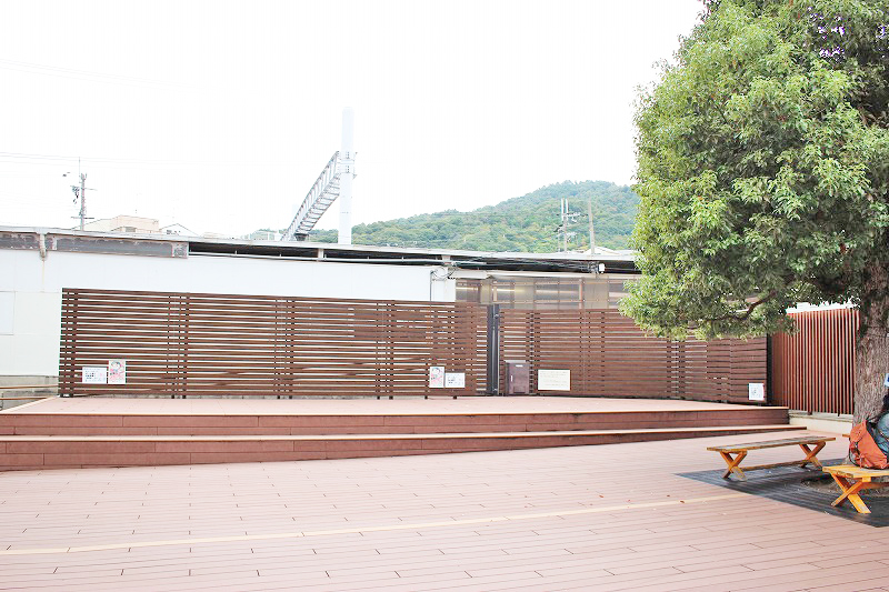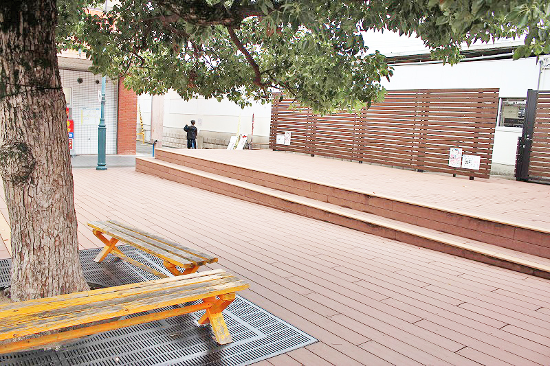 阪急箕面駅の広場って、広々していて良いですね。こちらに座っていただきます。