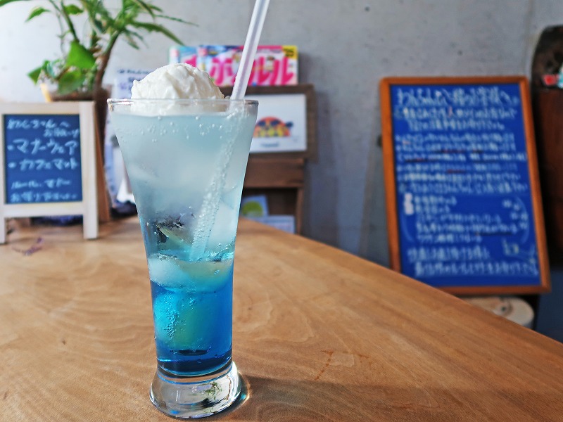 おすすめの「わんわんバスクプレート」と「クリームソーダ」を注文。クリームソーダは3色から選べるというので、青色をチョイス。