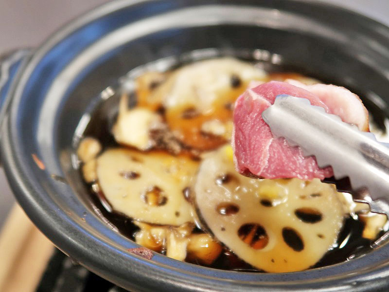 薄切りにされたれんこんと柚子が浮かぶお鍋に、合鴨をIN。
