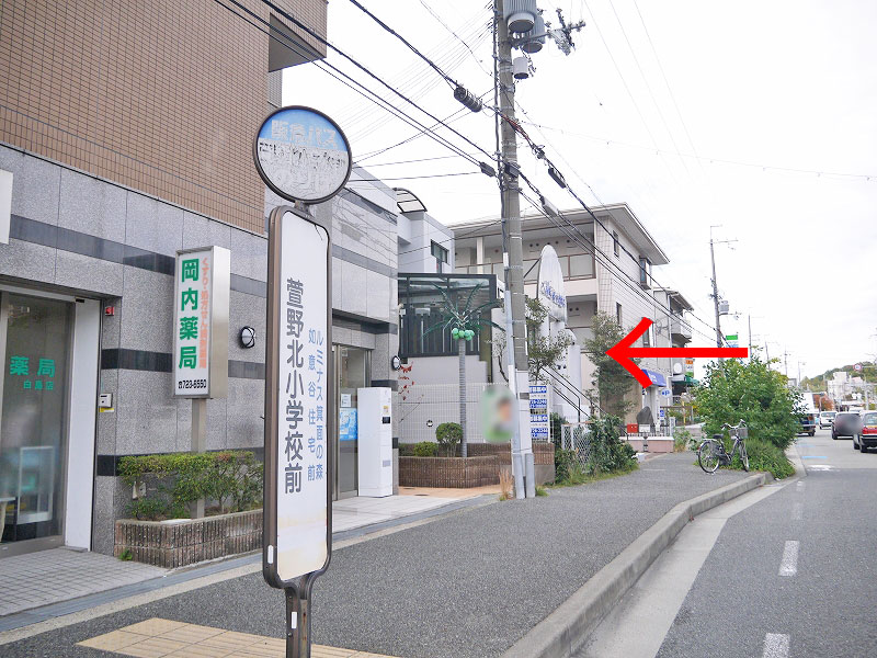 突き当りの「白島」の信号を西に曲がった、阪急バス「萱野北小学校前」の近くにあります。