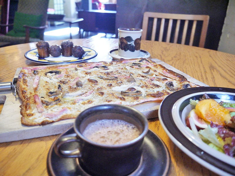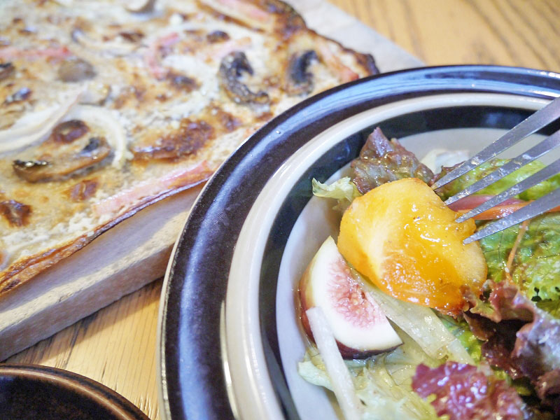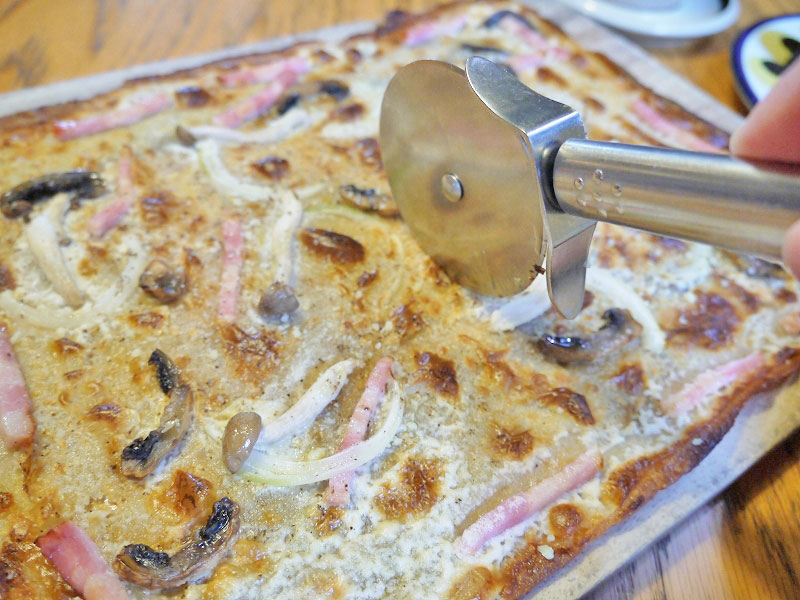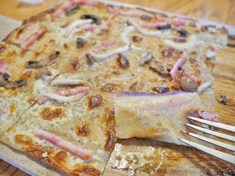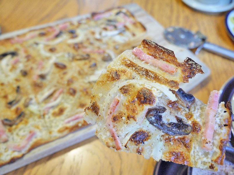 キノコ、玉ねぎ、ベーコンもたっぷり。生地はとても薄いので、大きいけどペロッと食べれちゃいましたよ。