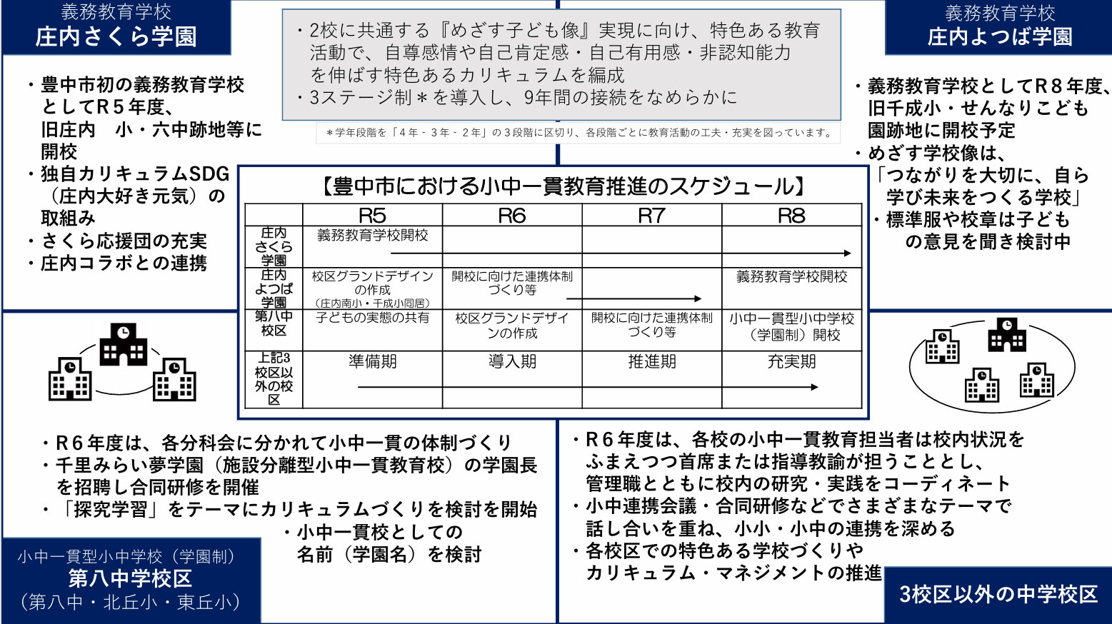 豊中市では小学校と中学校を連携することで9 年間の総合的な学習環境を提供するため、小中一貫教育を推進していて、その一環での「開校」ということのようですね。